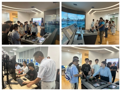 在新建成的培训中心内,同学们重点参观了国内领先的“使用气体或其他低闪点燃料船舶船员基本培训(T11/T12)实验室”以及配置先进的新型航海模拟器。授课教师结合实物与操作平台,现场讲解了低碳/零碳燃料应用、智能船舶能效管理、绿色航行策略等核心知识,同学们也纷纷体验了黄浦江航道的模拟操船,身临其境地体验驾驶台船舶操纵的场景。